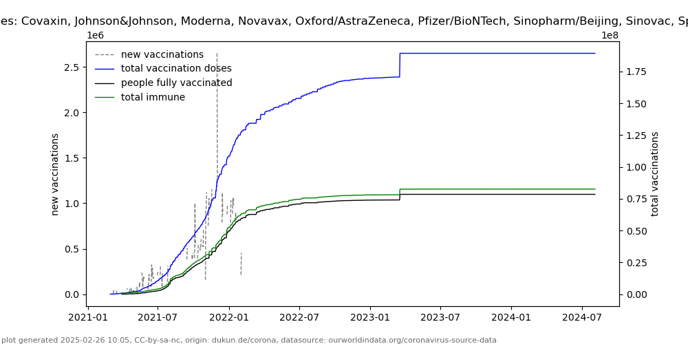 | Impfstoffe | Covaxin, Johnson&Johnson, Moderna, Novavax, Oxford/AstraZeneca, Pfizer/BioNTech, Sinopharm/Beijing, Sinovac, Sputnik Light, Sputnik V |